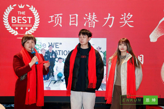 接下来迎来了期待已久的表彰环节,新秀奖由聪慧踏实的孙心仪获得,优秀支持奖由适应能力、综合能力较强的李卓然获得,优秀支持团队奖获得者是销售商务组。销售团队在公司起到中流砥柱的作用,他们在外风雨来,风雨去,为公司的销售额做出了巨大贡献。优秀主管奖获得者是皮雅青,细心负责的她不仅把质控组的工作做得井然有序,还将实验室管理得有条不紊。优秀销售奖、收官保卫战银奖的获得者是张旭,他用实际行动与业绩证明了自己一年的付出与自己的能力,希望在新的一年大家都可以再接再厉。项目潜力奖最终由P项目组获得,短视频、公众号以及公司官网上相关内容的发布不仅提升了公司的品牌价值也让更多的客户可以看到恩坤。随后是领导致辞环节,在热烈的掌声中,顾工上台为大家演讲。感慨了过去一年中大家遇到的种种挑战,也在逆境中看到了不少机遇。新的一年有新的目标与任务,期待着大家一起勇攀高峰。